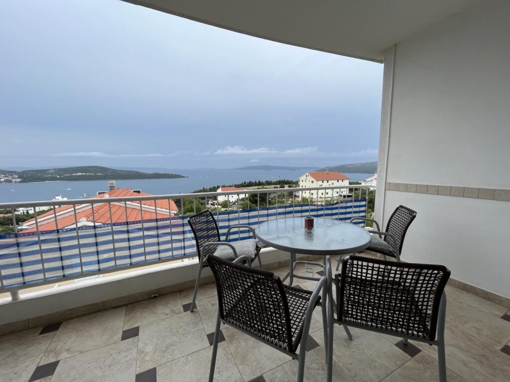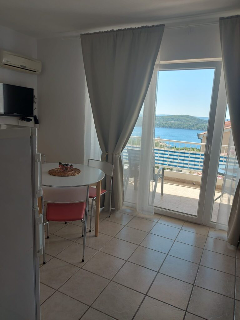 Kolaž fotografija apartmana Jasna s pogledom na more, kuhinjom, kupaonicom i sobama
