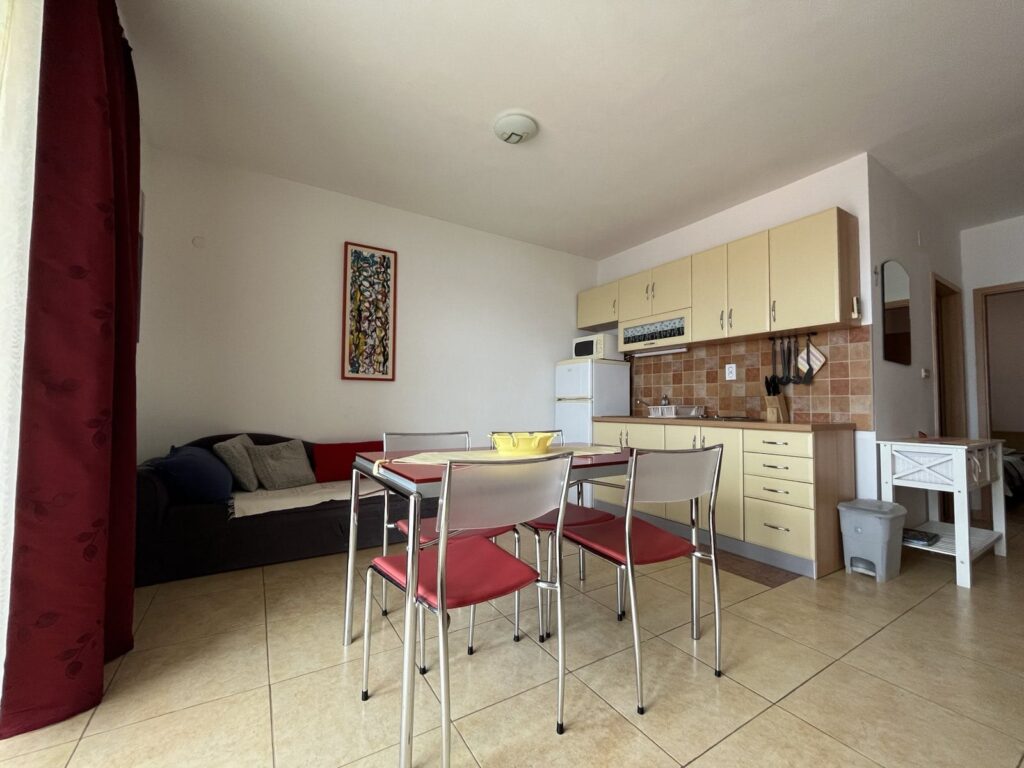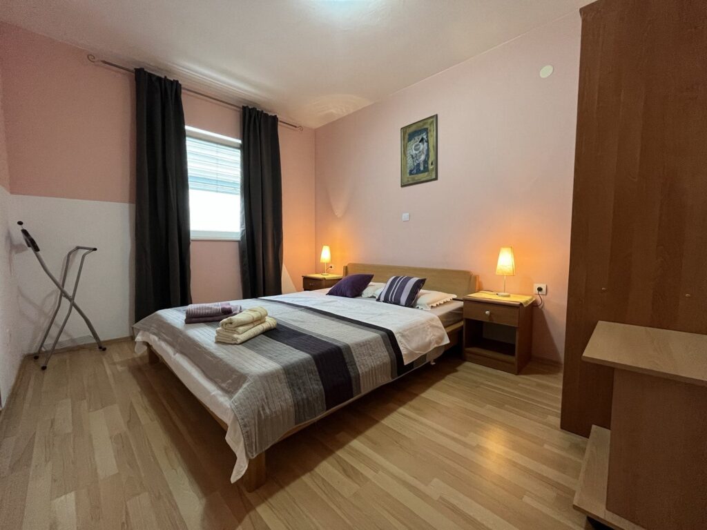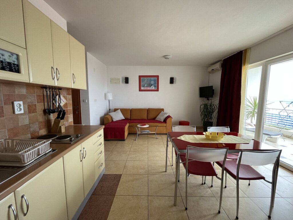 Jedna dvokrevetna soba, dnevni boravak sa dodatnim ležajem za dvije osobe, potpuno opremljena kuhinja, WC sa tušem, balkon (10m2), SAT/TV, klima uređaj, Wi-Fi .